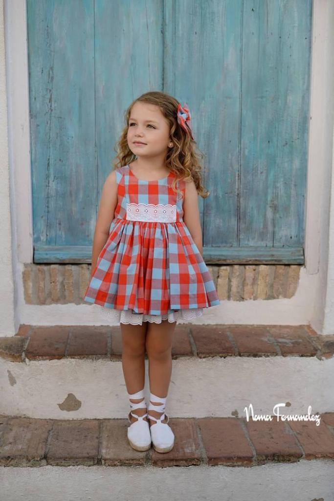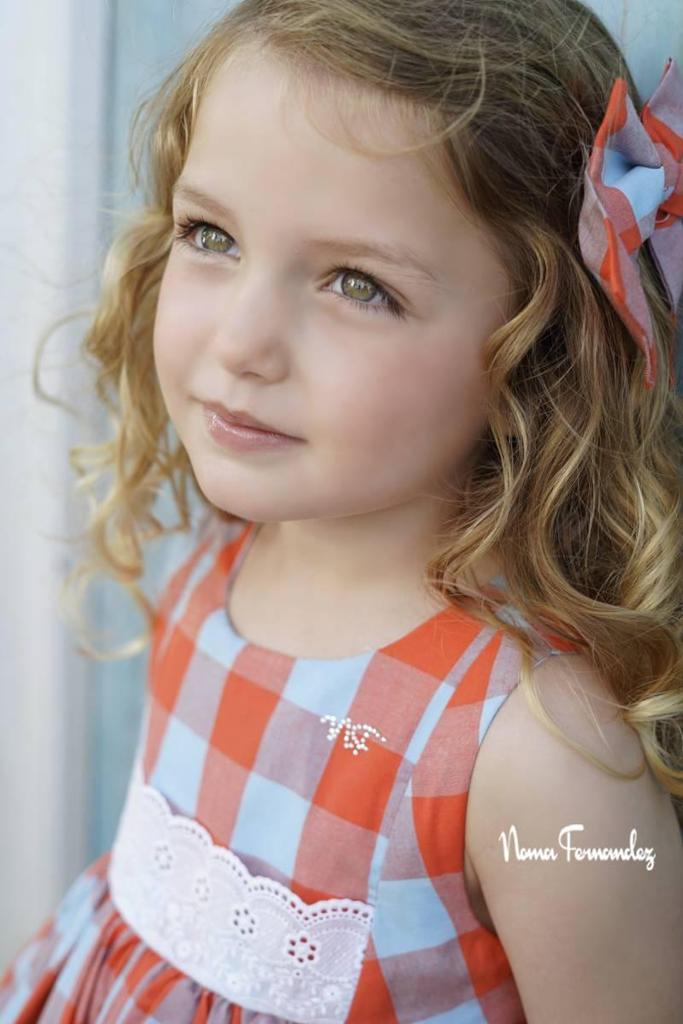 Jesusito en vistosos cuadros perteneciente a la colección Burdeos de la marca Noma Fernández, para la temporada primavera verano 2025. Es un espectáculo cuando lo vemos puesto en nuestras peques.